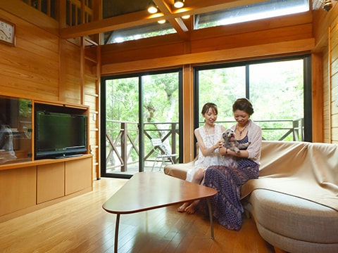 森のコテージは、ホテル棟より少しはなれたプライベート空間。ペットのワンちゃんと楽しく安心してお泊りいただけます。1階にリビングルーム・ベッドルーム・キッチン、中2階には和室6畳間。全長数キロにもおよぶ散策コースは、ワンちゃんも大喜び。海と森に包まれる、至福のやすらぎをどうぞ。