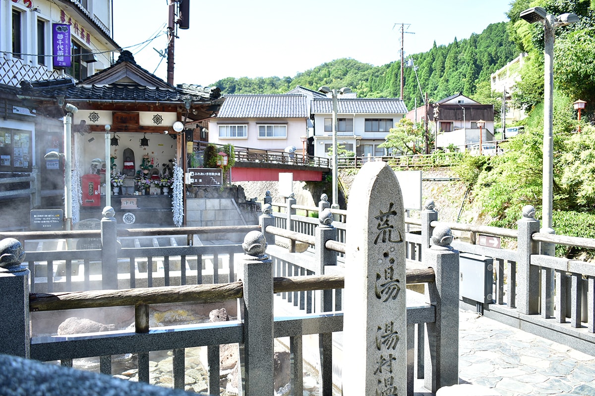 湯村温泉は1200年以上昔から豊富な天然温泉が自噴し、中心地の荒湯(源泉)は98度、470リットルの温泉が湧出しています。もうもうと湯気が上がっている姿は湯村温泉ならではの風景です。