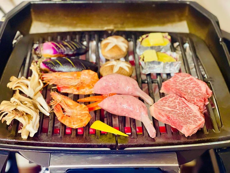 宮城黒毛和牛ステーキ、海老と帆立のアヒージョ、お花を散りばめたサラダなど、彩りも豊かな贅沢BBQをプライベートダイニングでご堪能いただけます。