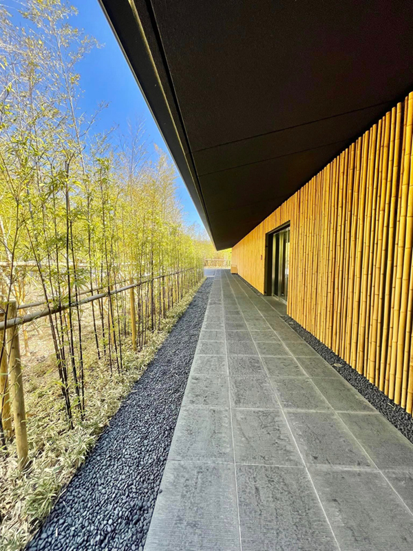 エントランス棟にはロビーや食事処のほか、大浴場やトラベルライブラリーなどがまとまっており、愛犬ルームは庭園を下った一番奥に離れとして一棟ある。