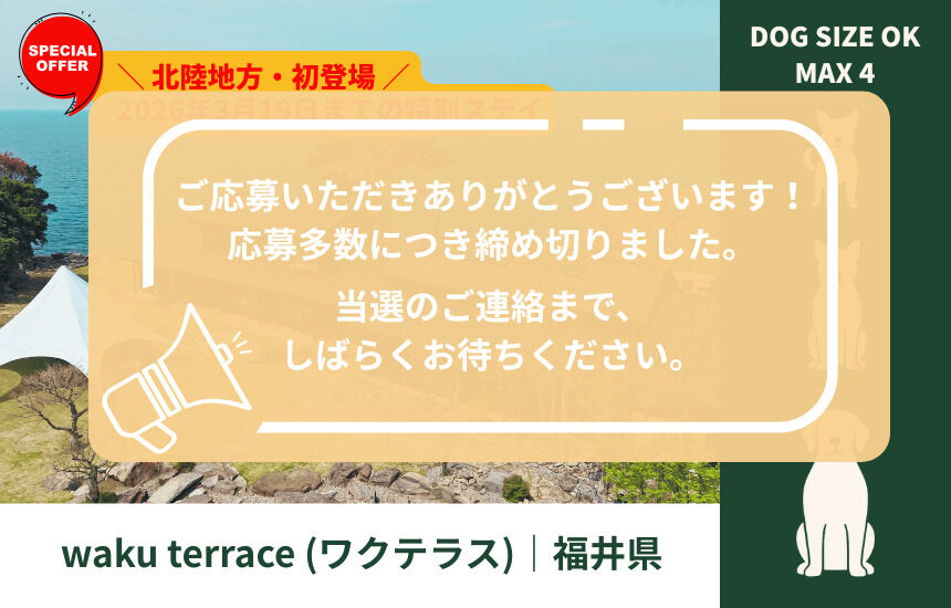 【当選発表】:当選結果は随時メール(yoyaku@travelwithdog.com)にてお送りさせていただきます。