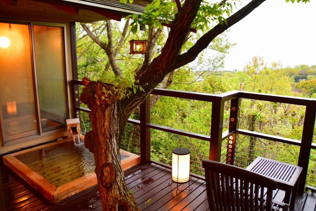 全室にかけ流し露天温泉と内湯。窓一面に広がる青海原と新緑は自然美の絵画のよう。