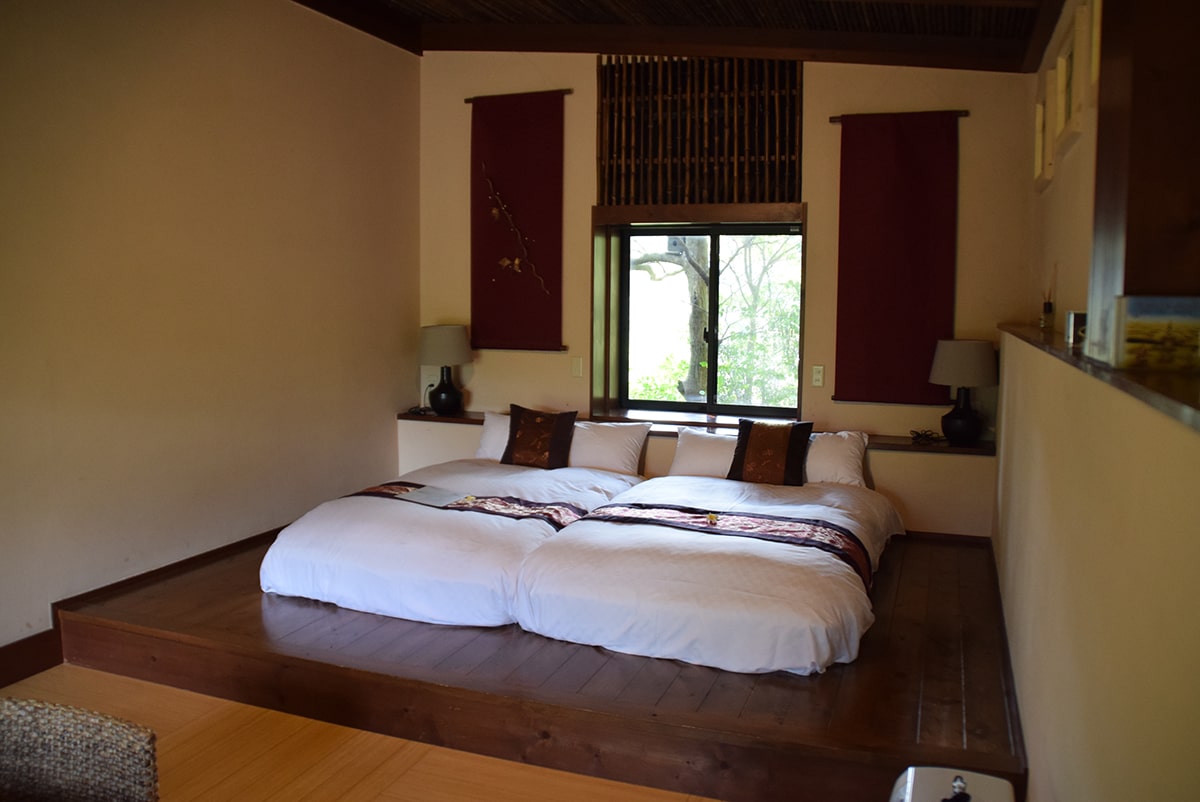 プライベート空間でのんびりと気兼ねなくお過ごしください。本館から近いのでわんちゃんの天然温泉かけ流しのドッグスパや森の中のドッグランなどもあわせてご利用が出来ます。ベッドコーナー、座卓コーナー、そしてソファコーナーが大きなワンルームになっています。