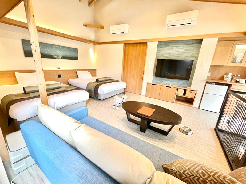 わずか5室しかない上質な和モダンの客室です。全室 天然温泉露天⾵呂、プチわんちゃん温泉プール、ウッドデッキを設けており、愛犬と共に寛ぎの時間をお過ごしいただけます。愛犬用の各種アメニティも取り揃えております。